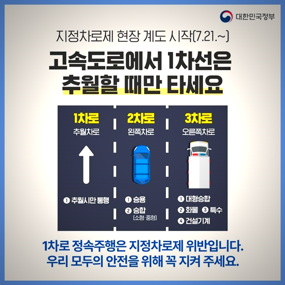 2023년 7월 21일부터 현장 계도 기간 시작이니 잊지 마시고 1차로는 꼭! 추월차로로만 이용하시기 바랍니다.