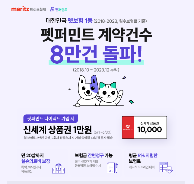- 리워드 혜택: 다이렉트 펫보험 월납보험료 2만원 이상 가입 시, 신세계상품권 1만원이 지급됩니다. 이는 2회차 보험료까지 납부한 정상계약에 한해 지급됩니다.