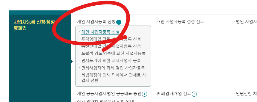 그 후 '사업자등록신청(개인)'을 선택하여 사업자등록 신청서를 작성하는 단계로 이동합니다.