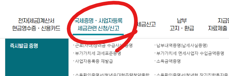 로그인 후, 상단 메뉴에서 '사업자등록 신청/신고'을 클릭한 다음