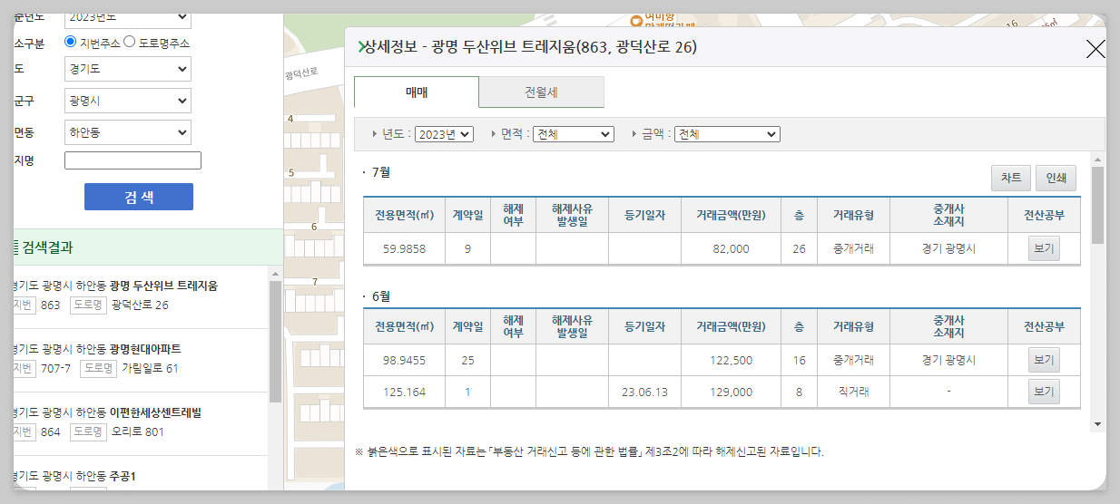 이 화면에서 조회를 원하는 주소를 입력하고 실거래가를 확인할 수 있습니다.