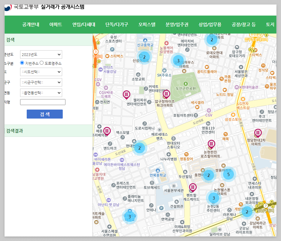 ▲ 국토교통부 사이트에서는 아파트를 포함, 다세대부터 오피스텔 등 다양한 부동산의 실거래가를 조회할 수 있습니다.