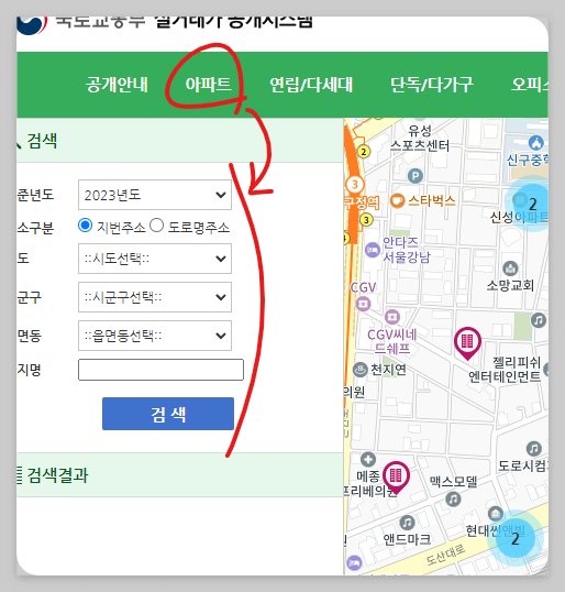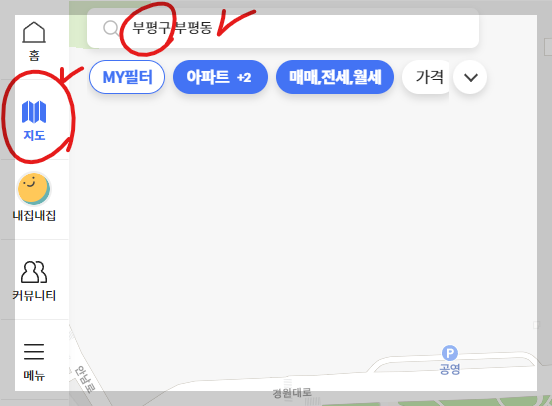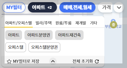 ▲ 아파트 외에 다른 부동산을 보고싶다면 이 부분을 눌러 원하는 부동산을 체크한 후 확인하실 수 있습니다.