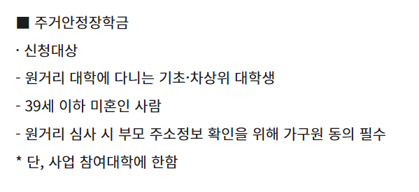 주거안정장학금은 부모님과 따로 거주하는 학생을 우선 지원한다. 즉, 본가와 학교가 먼 경우 더 유리할 수 있다.