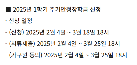 2025학년도 1학기 주거안정장학금은 2월 4일부터 3월 18일까지 신청 가능하다.
