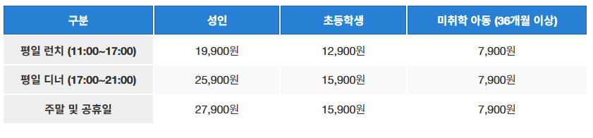 | 평일 런치 (11:00~17:00) | 19,900원 | 12,900원 | 7,900원 |