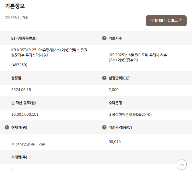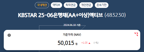 - ETF명(종목번호): KB KBSTAR 25-06은행채(AA+이상)액티브 증권 상장지수 투자신탁(채권) (483230)